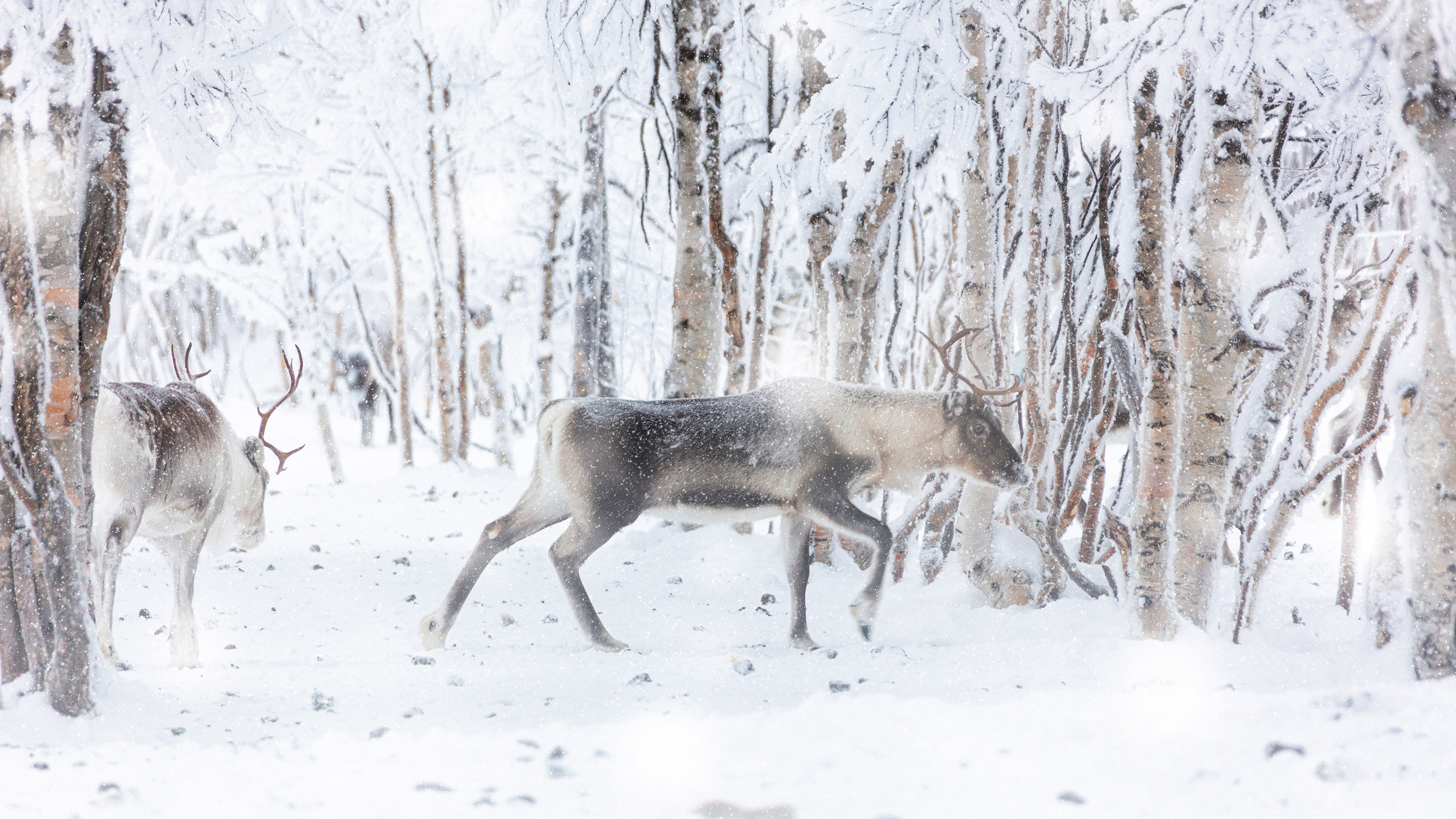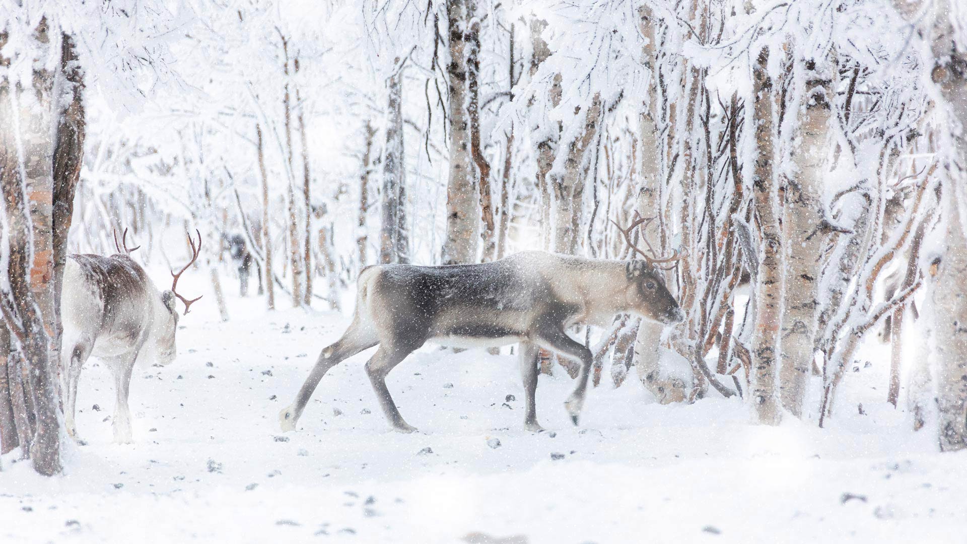 Reindeer during winter snowfall, Lapland, Finland (© Roberto Moiola/Getty Images)